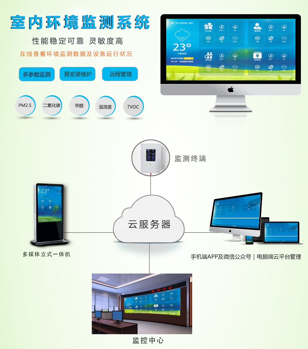室內專(zhuān)用環境檢 監測係統終端(duān)是一款專門針對家居及公共場所室內環境而定製全麵24小時實時在線監測的係統,可以在手機端、電腦端遠程查(chá)看相關監(jiān)測數(shù)據。